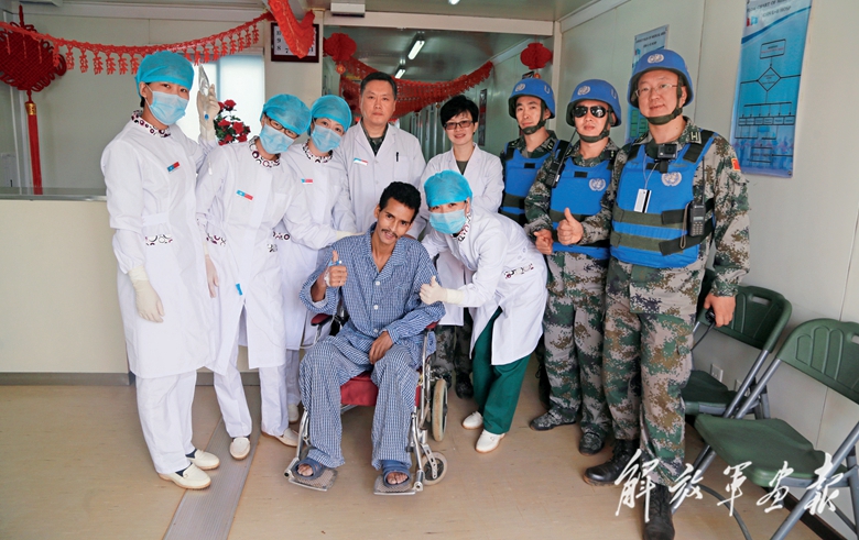 2015年2月26日,第2批赴馬里維和醫(yī)療分隊晝夜不息,成功搶救一名受傷人員。該傷員(坐輪椅者)傷愈出院時,感動地與醫(yī)護人員合影。