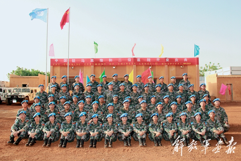 2014年4月23日,中國駐馬里維和二級醫(yī)院在首批赴馬里維和醫(yī)療分隊的努力下建成開診。圖為官兵在開業(yè)慶典當天合影留念。