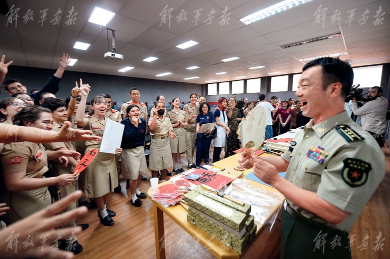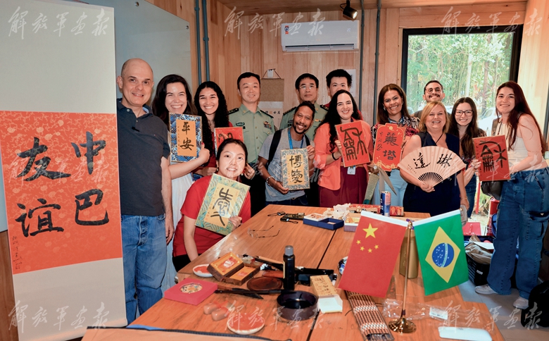 書畫創(chuàng)作員與巴西陸軍學(xué)校師生交流中國(guó)書法藝術(shù)。