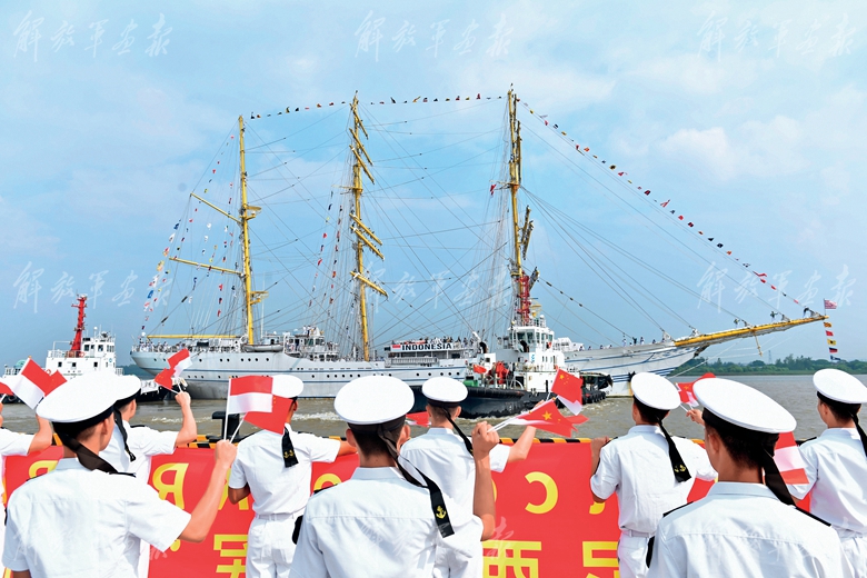 中方官兵列隊歡迎印度尼西亞海軍“畢瑪蘇吉”號風帆訓練艦訪滬。