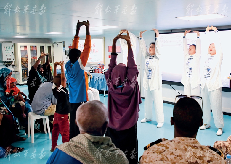 當地時間2024年12月9日,和平方舟醫(yī)院船訪問吉布提期間,開展“慢病防治,始于足下”主題公益活動。圖為中醫(yī)科醫(yī)生現場帶教中國傳統健身功法“八段錦”。(攝影/劉志磊 )