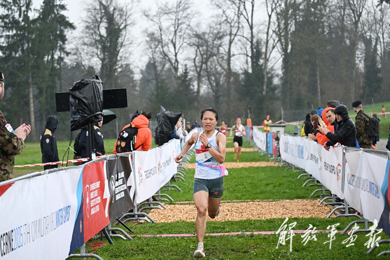 當(dāng)?shù)貢r間3月26日,我軍選手李百慧在女子越野跑比賽中沖向終點。