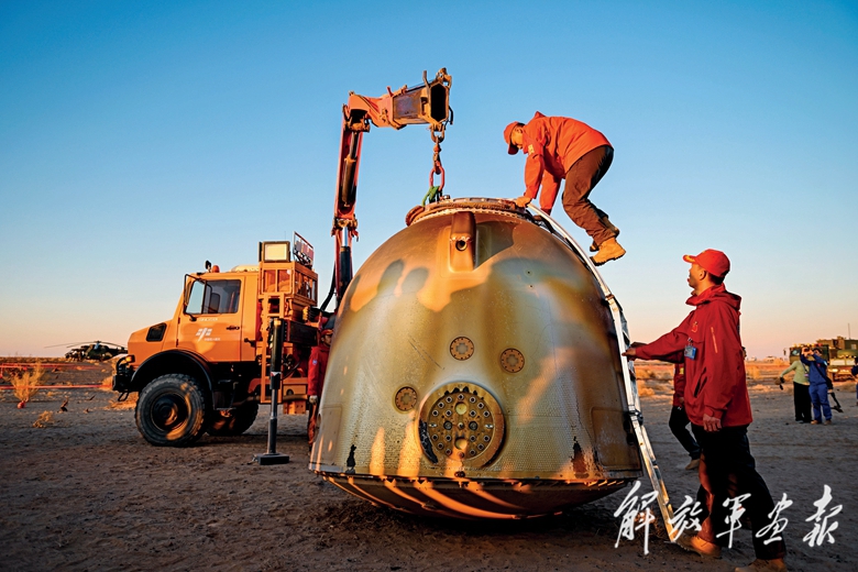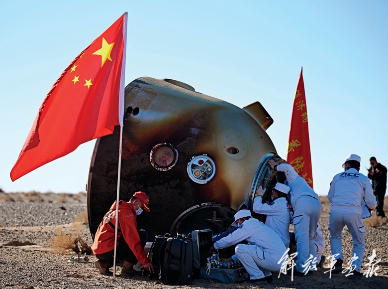 4月30日,工作人員在現(xiàn)場處置返回艙。