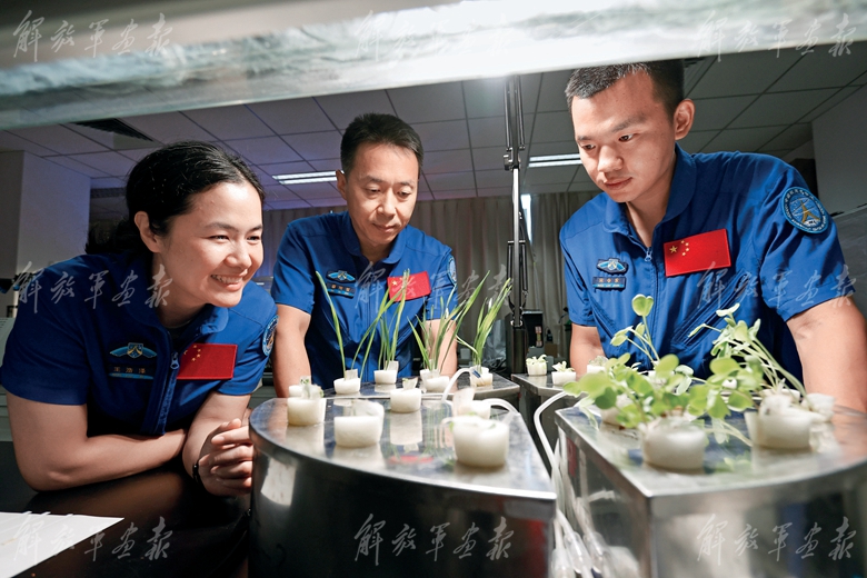神舟十九號(hào)航天員乘組(從左至右:王浩澤、蔡旭哲、宋令東)進(jìn)行植物培養(yǎng)訓(xùn)練。(攝影/徐 部)
