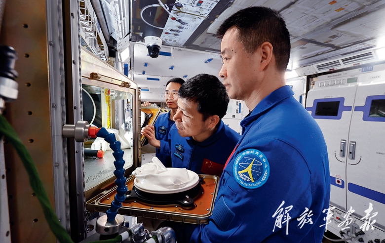神舟二十號航天員乘組(從前至后:陳冬、王杰、陳中瑞)進(jìn)行在軌實(shí)驗(yàn)操作訓(xùn)練。(攝影/徐 部)