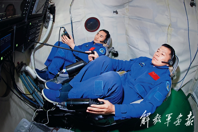 神舟二十號航天員陳冬(前)、王杰(后)在貨運(yùn)飛船模擬艙內(nèi)訓(xùn)練。(攝影/徐 部)