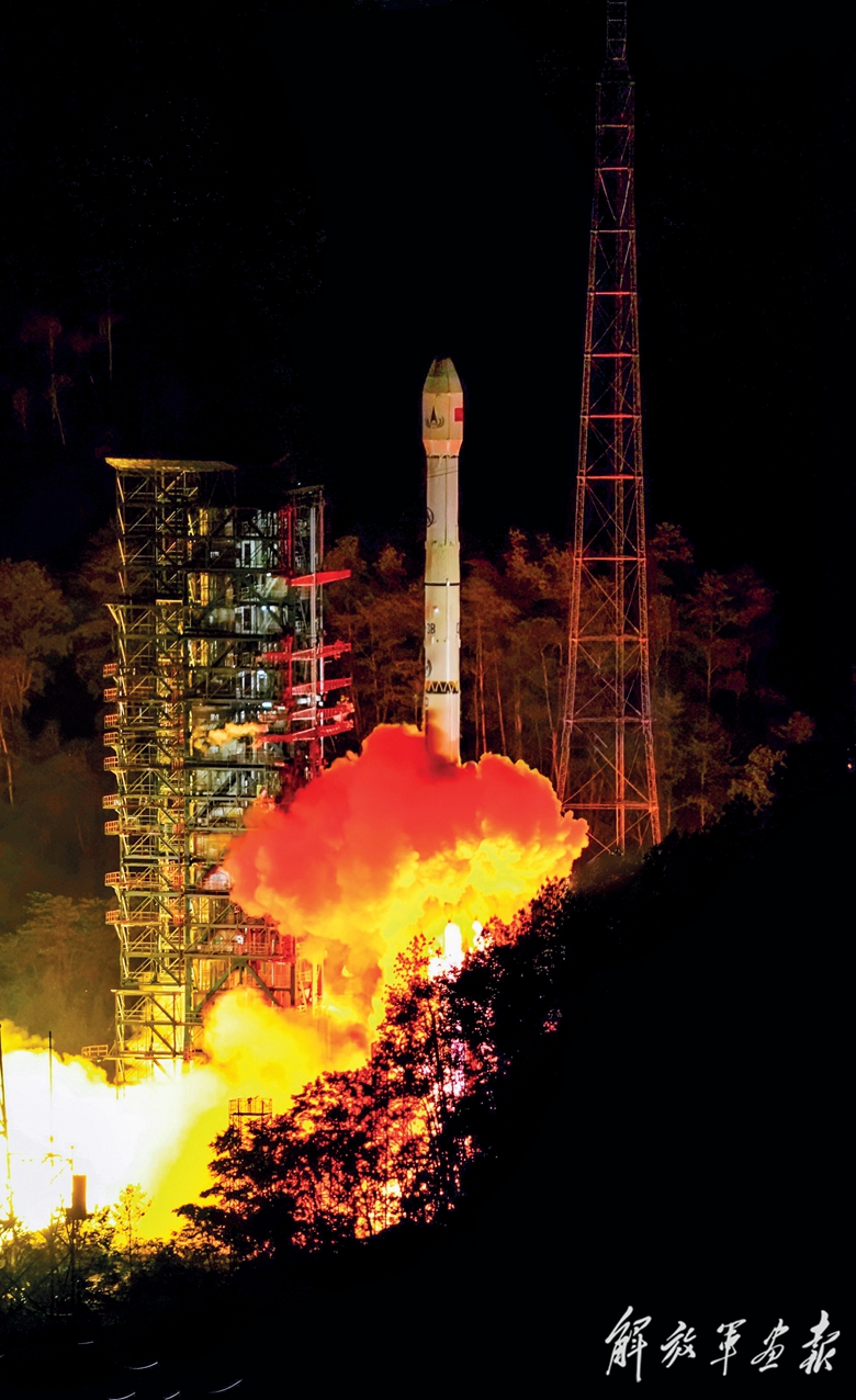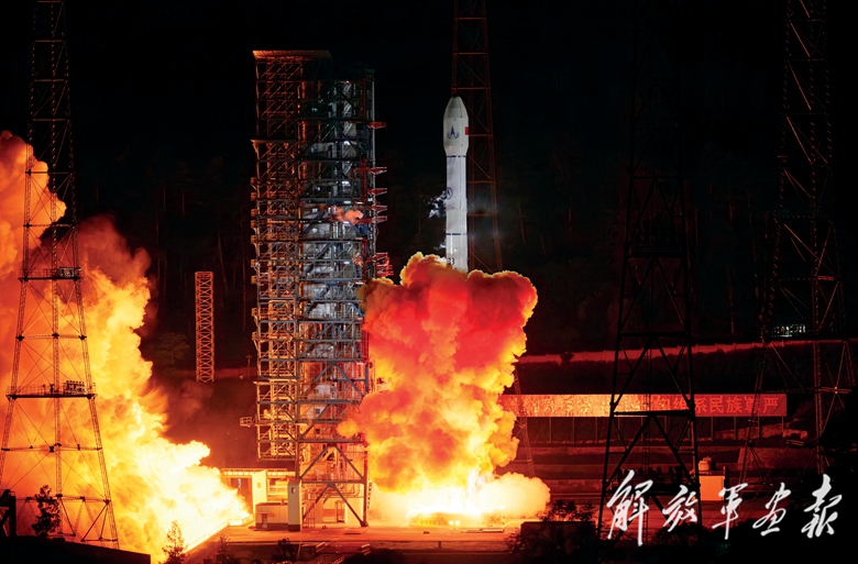長征三號(hào)乙遙一一〇運(yùn)載火箭點(diǎn)火發(fā)射瞬間。(攝影/記者 劉 丹)