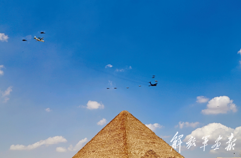 當?shù)貢r間5月1日,埃及開羅,參加中?!拔拿髦?2025”空軍聯(lián)合訓練的中埃雙方戰(zhàn)機超低空編隊飛越金字塔。(攝影/郝 煒)