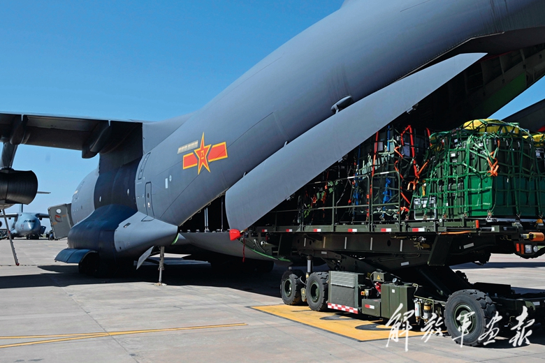 4月13日,中國境內(nèi),參加中?!拔拿髦?2025”空軍聯(lián)合訓練的中國空軍運-20飛機裝載物資。