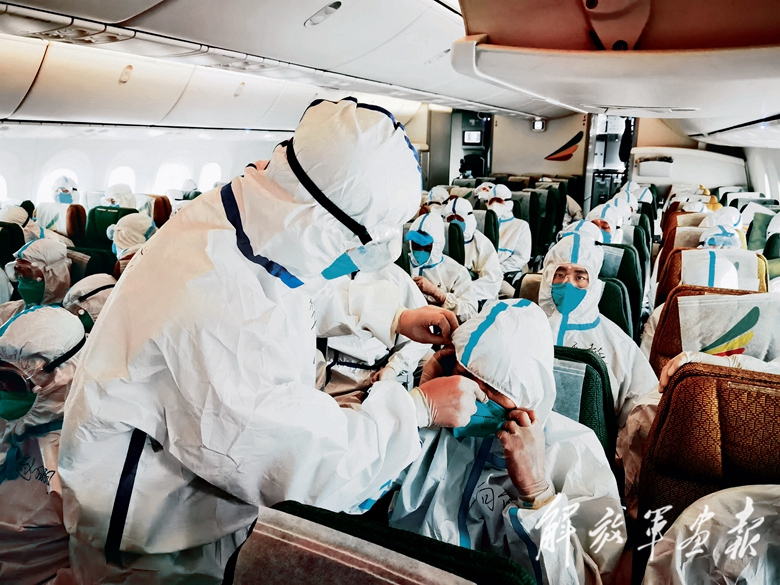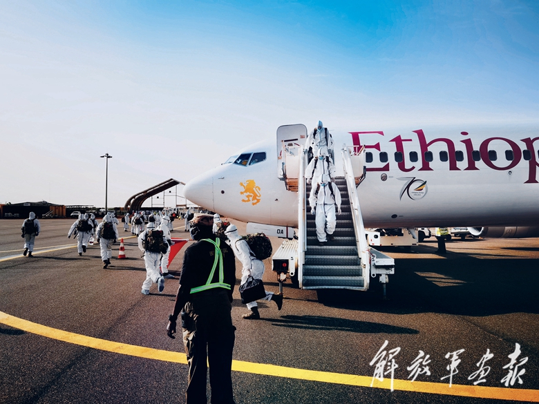 飛機進入非洲大陸上空時,已近清晨。忽然間,朝陽照亮了機艙。透過厚厚的護目鏡,幾個來回穿梭忙碌的身影在官兵眼前逐漸變得清晰:逐個檢查隊員防護裝備的軍醫(yī)李小龍、不斷提醒大家注意乘機安全要求的中隊長蘭崇暉、全程負(fù)責(zé)與機組人員溝通行程及注意事項的外事副大隊長高山和3位翻譯人員……厚重的防護服下,滿溢著溫暖和力量。