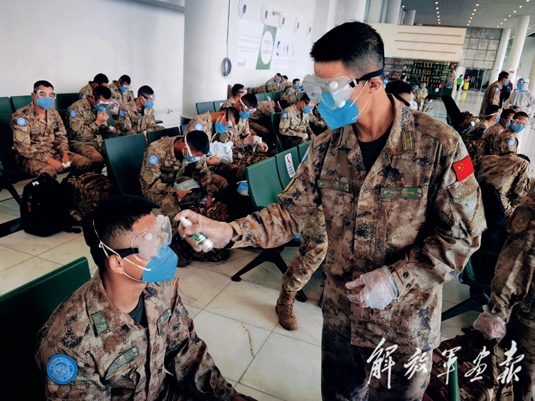 乘坐擺渡中巴車向營區(qū)機動途中,目光所及,五星紅旗迎風(fēng)飄揚,親切感、自豪感頓時涌上官兵心頭。抵達中國維和營地后,大家開始進行逐人逐箱逐車洗消工作,對隔離營區(qū)設(shè)施進行徹底消殺,為接下來為期2周的醫(yī)學(xué)隔離觀察做好準(zhǔn)備。