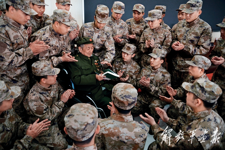 97歲的老英雄孟昭身為預(yù)定新兵講革命傳統(tǒng),并向新戰(zhàn)友贈送紅色書籍。