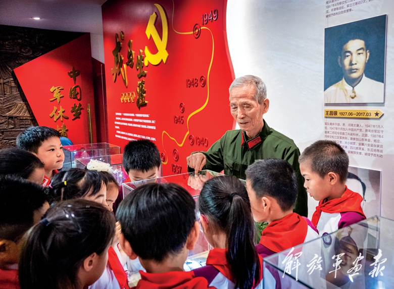 老兵劉煥文為前來參觀的小學生講述歷史實物背后的故事。