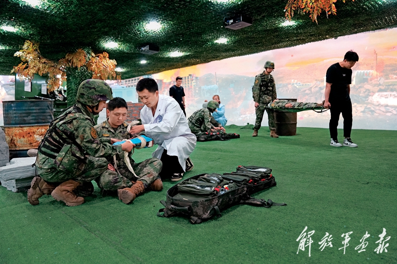 軍地人員在醫(yī)院仿真戰(zhàn)傷救治訓(xùn)練中心開展“戰(zhàn)傷救護(hù)”模擬體驗(yàn)。