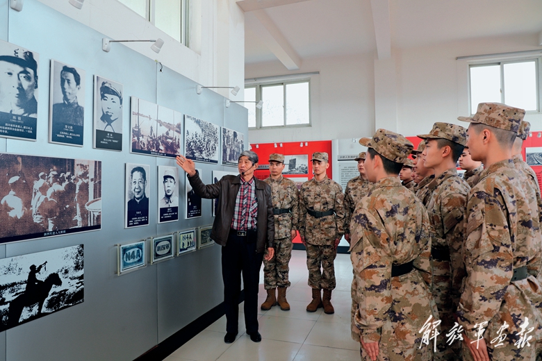 張明海(左一)為預(yù)定新兵講述新四軍的戰(zhàn)斗故事。