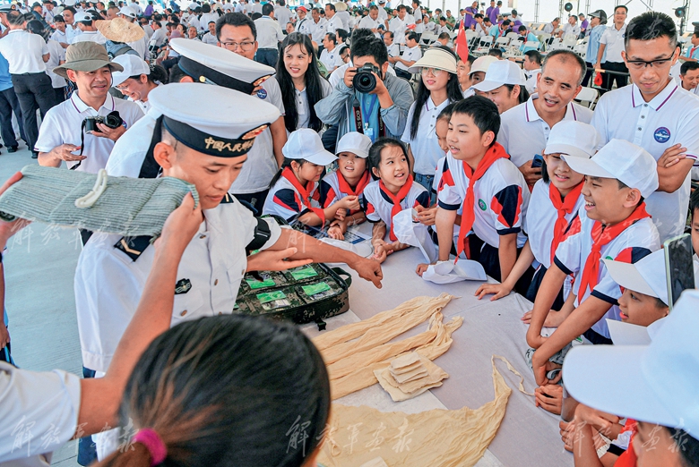 在湛江艦艦艏,老兵和學(xué)生合響《歌唱祖國》。