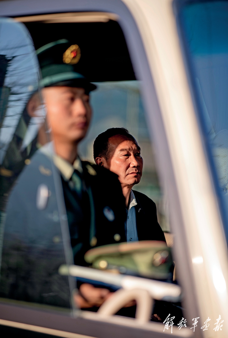 乘車去往營區(qū)的路上,彭敬貴烈士的弟弟彭生(右)神情凝重。