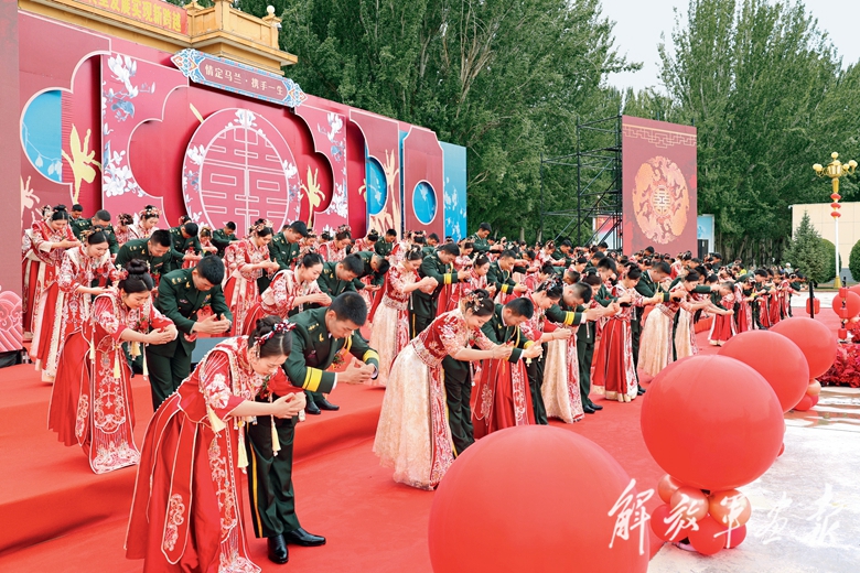 在官兵和親屬們的見證下,新人們行卻扇禮、訂立婚書、解纓結(jié)發(fā)、執(zhí)手盟誓……在這幸福的時刻,深厚的中華傳統(tǒng)文化與建功軍營的豪情壯志交織相融。“右手敬禮、左手牽你,此身許國亦許卿。我們相愛,共同奮斗,為了彼此,更為了祖國?!?/span>