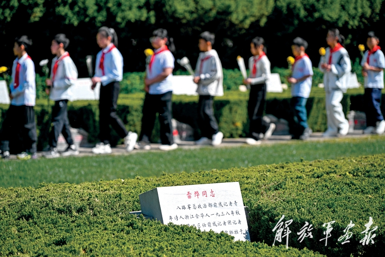 4月1日,石家莊市小學生前往華北軍區(qū)烈士陵園悼念英烈。這是雷燁同志墓碑。