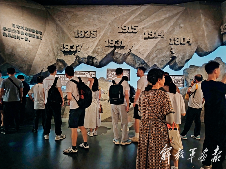 觀眾駐足參觀展覽第一部分“奮起抵抗 中國人民打響世界反法西斯戰(zhàn)爭第一槍”。