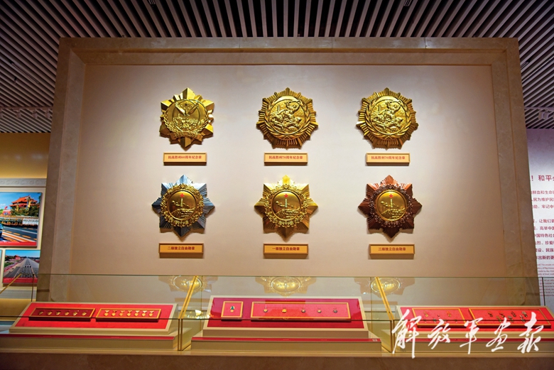 展覽第八部分展區(qū)展示了抗戰(zhàn)勝利紀(jì)念章和獨立自由勛章。