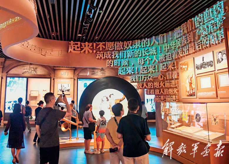 展廳為抗戰(zhàn)歌曲設(shè)置了互動播放裝置,觀眾駐足了解抗戰(zhàn)歌曲的創(chuàng)作故事。