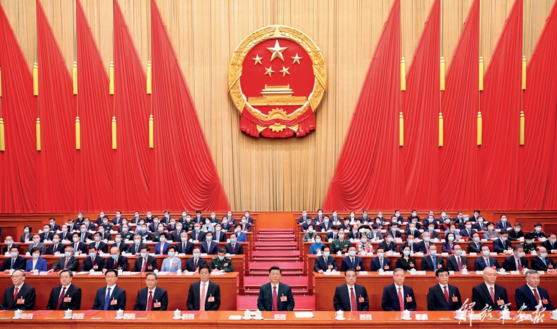 主席臺后幕正中,國徽高懸,熠熠生輝。現(xiàn)場近3000名全國人大代表共同見證這一神圣時刻。