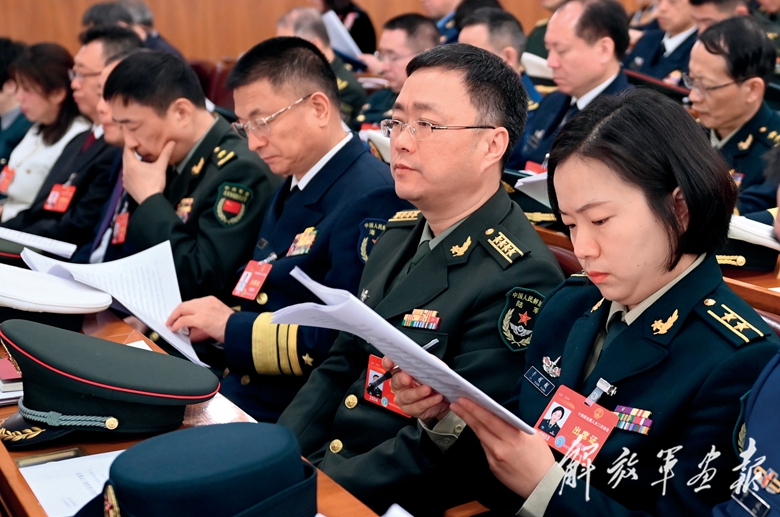 3月5日,十四屆全國(guó)人大二次會(huì)議在北京人民大會(huì)堂開幕。圖為軍隊(duì)人大代表認(rèn)真聽取政府工作報(bào)告。(攝影/馬增科)