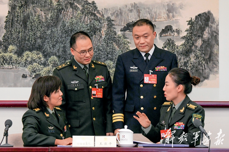 3月5日,十四屆全國(guó)人大二次會(huì)議舉行小組會(huì)議。圖為會(huì)議間隙,軍隊(duì)人大代表討論交流。(攝影/記者 穆瑞林)