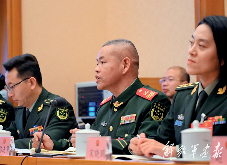 3月5日下午,解放軍和武警部隊(duì)代表團(tuán)分組審議政府工作報(bào)告。圖為軍隊(duì)人大代表發(fā)言。(攝影/記者 穆瑞林)