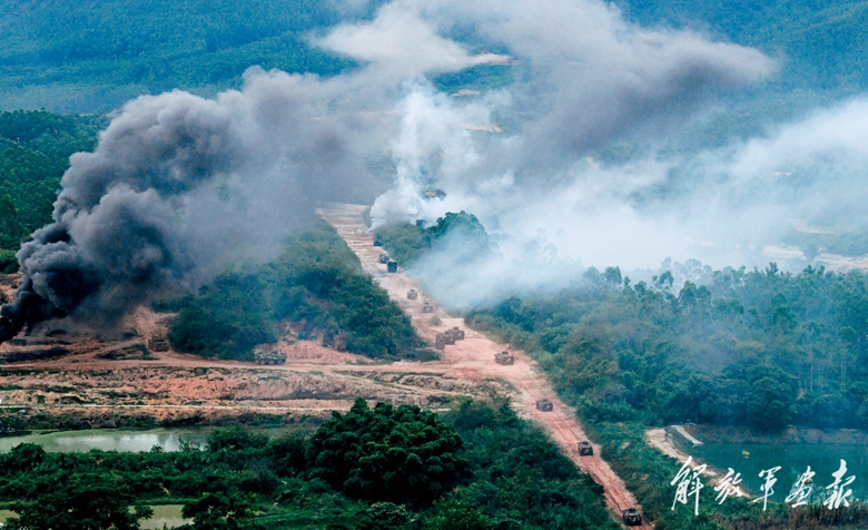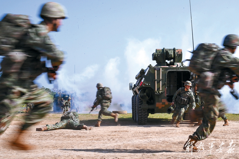 進攻戰(zhàn)斗訓(xùn)練中,官兵快速下車。