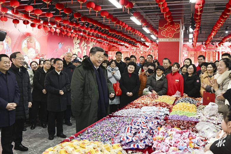 1月22日至24日,中共中央總書(shū)記、國(guó)家主席、中央軍委主席習(xí)近平冒著嚴(yán)寒來(lái)到遼寧,看望慰問(wèn)基層干部群眾。這是23日上午,習(xí)近平在沈陽(yáng)大東副食品商場(chǎng)考察時(shí),同店主和顧客親切交流,向大家致以新春祝福。 攝影/新華社記者 謝環(huán)馳