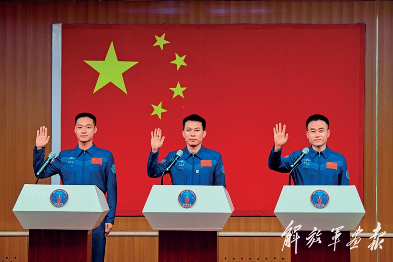 2023年10月25日上午,神舟十七號載人飛行任務(wù)航天員湯洪波(中)、唐勝杰(右)、江新林在酒泉衛(wèi)星發(fā)射中心問天閣與中外媒體記者集體見面。(攝影/記者 王 ?。?/span>