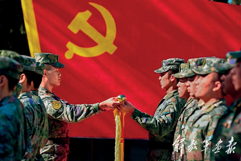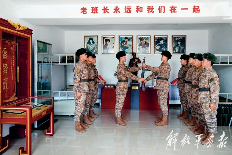 2023年2月,在毛澤東等老一輩革命家為雷鋒同志題詞60周年之際,陸軍第79集團軍某旅“雷鋒班”為新入班戰(zhàn)士舉行“雷鋒槍”交接儀式。(攝影/特約記者 張永進)