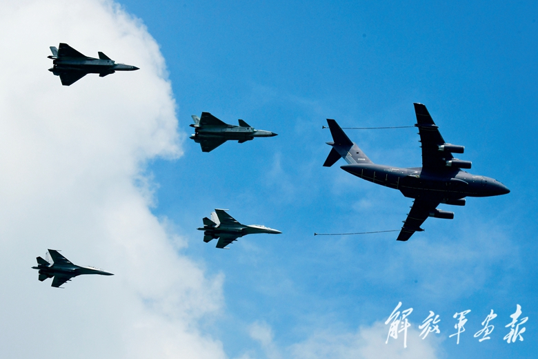 2023年7月26日至30日,空軍航空開放活動·長春航空展在吉林長春舉辦。圖為運油-20與殲-20雙機、殲-16雙機進行空中加油通場展示。(攝影/記者 王 ?。?/span>