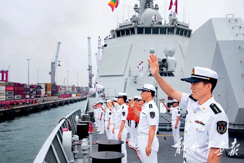 當?shù)貢r間2023年6月22日至7月18日,中國海軍第43批護航編隊對科特迪瓦、加納、尼日利亞、加蓬、剛果(布)進行友好訪問。圖為護航編隊抵達剛果(布)黑角,南寧艦官兵向碼頭迎接人員揮手致意。(攝影/劉哲浩)