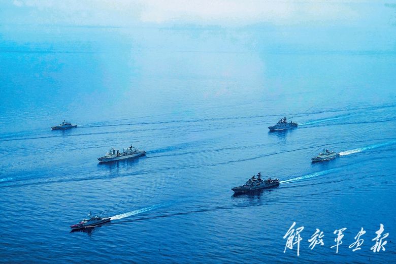 2023年7月,“北部·聯(lián)合-2023”演習在某海域舉行。圖為中俄參演艦艇編隊開展海空護航演練。(攝影/劉 丹)