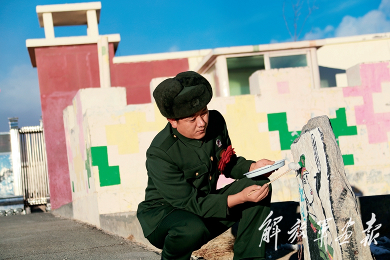 然后,蒲存軍回到連隊門前,最后一次為“守邊石”補色,留下一名老兵對邊關(guān)和連隊無限的眷戀。