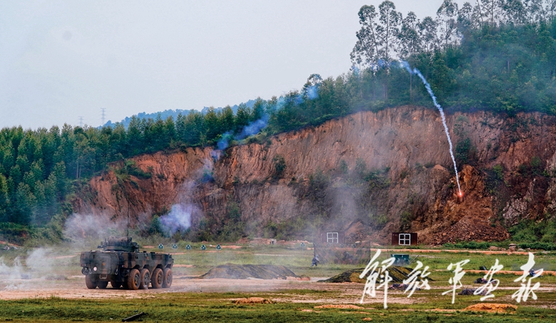 步戰(zhàn)車發(fā)出信號彈指示目標(biāo),配合反裝甲組利用單兵火箭對“敵”裝甲力量實施火力摧毀。