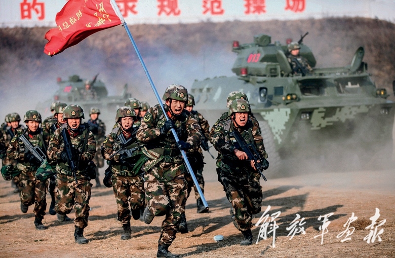訓(xùn)練中,官兵發(fā)起沖鋒。