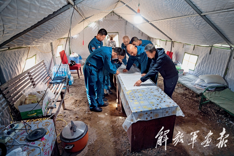 2020年6月,內(nèi)蒙古阿拉善左旗,執(zhí)行飛播任務的機組人員在帳篷內(nèi)研究飛行航線。