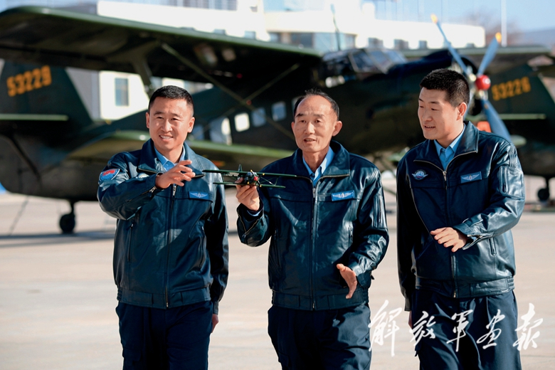 即將退休的老飛行員楊茂良(中)和年輕飛行員進行技術交流。