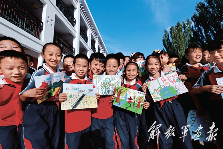 2020年,阿拉善左旗的小學生展示繪畫作品《飛播春天》。(資料圖片)