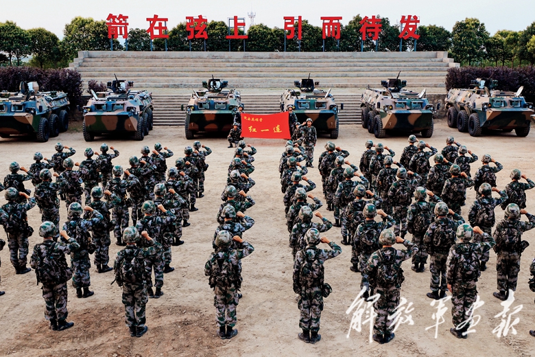 ?執(zhí)行大項(xiàng)任務(wù)前,“紅一連”官兵面向連旗宣誓。