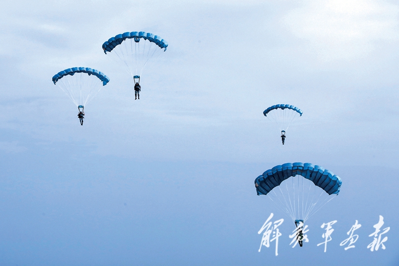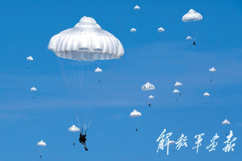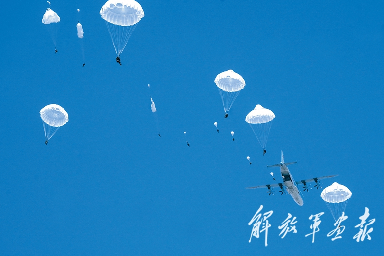 經(jīng)過空中編隊(duì)后,戰(zhàn)機(jī)抵達(dá)預(yù)定空域。機(jī)艙內(nèi)跳傘信號(hào)響起,全副武裝的傘兵迅速躍離機(jī)艙,朵朵傘花在空中競(jìng)相綻放,傘兵準(zhǔn)確操縱降落傘向預(yù)定地域飄去。