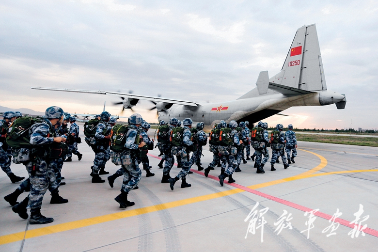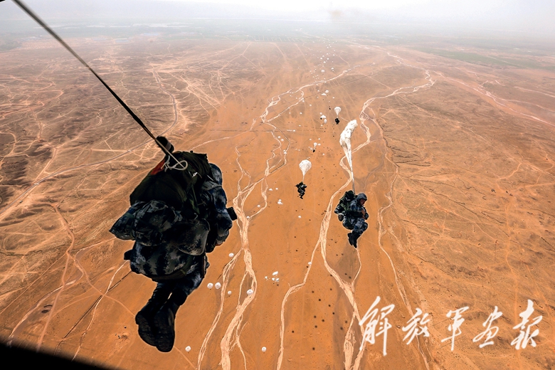 賀蘭山下,戈壁灘頭,某軍用機(jī)場(chǎng)一片忙碌??战当陈霉俦焖僬韨憔?、武裝披掛、快速登機(jī)。數(shù)十架滿載傘兵的戰(zhàn)機(jī)呼嘯升空,很快消失在天際,一場(chǎng)空降戰(zhàn)斗演練隨即展開。