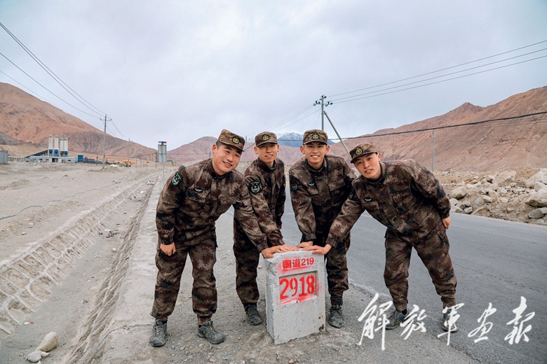 新兵們手摸路牌,在新藏線上留下自己的印記(右二為費(fèi)騰)。