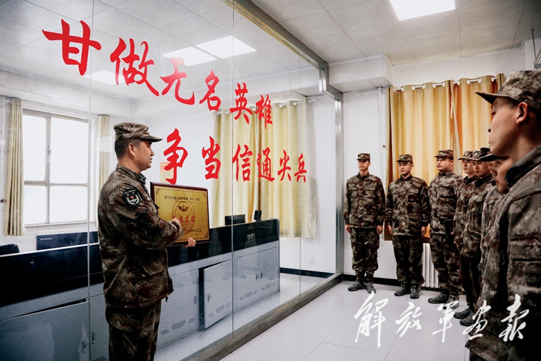 為新兵講述前輩官兵建設(shè)通信線路的奮斗故事。