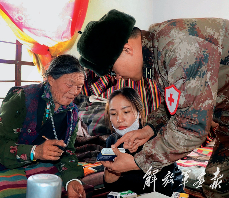 68歲的吉吉老人一早就等在家門口,迎接前來探望她的官兵。軍醫(yī)李文博為老人認(rèn)真檢查了身體,并留下所需藥品。吉吉老人雖然不會講漢語,但用藏語說得最多的就是“感謝解放軍”這句話。