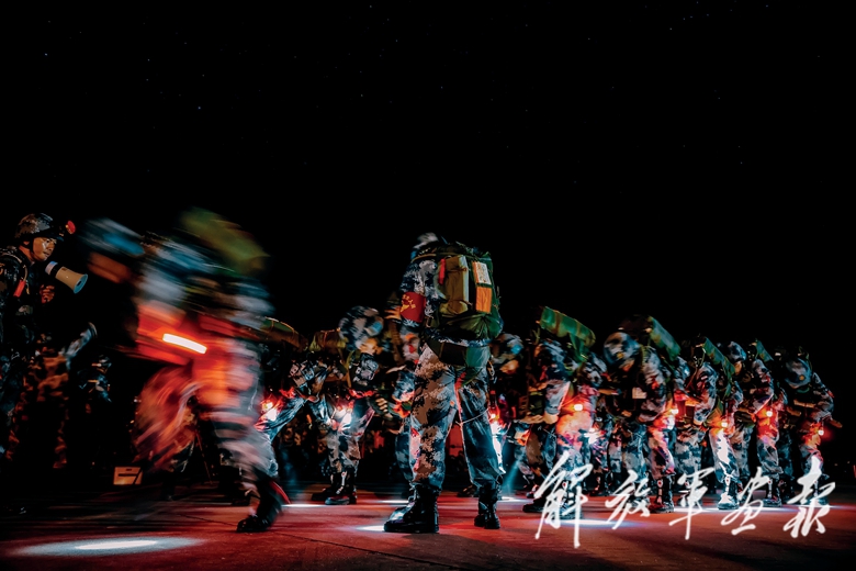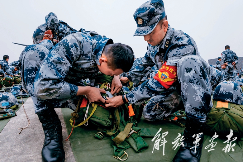 “好!”“好!”空投骨干對(duì)跳傘員的降落傘狀態(tài)和武器披掛情況進(jìn)行細(xì)致檢查后,一聲聲鏗鏘有力的對(duì)答回蕩夜空。
